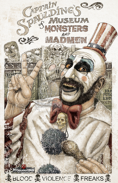 The Legendary Captain Spaulding/Sid Haig standing in front of his world famous Museum of Monsters & Mad Men from the Rob Zombie Movie "House of 1000 Corpses"