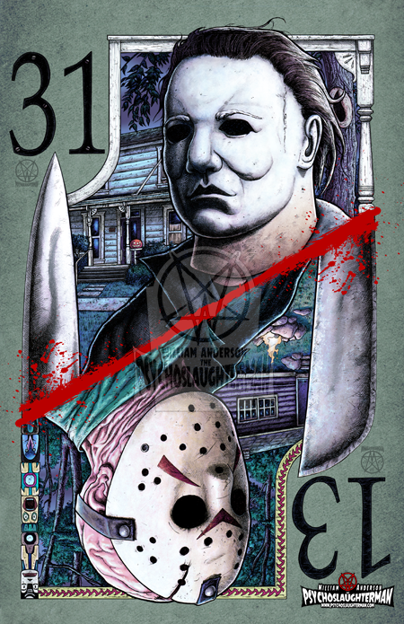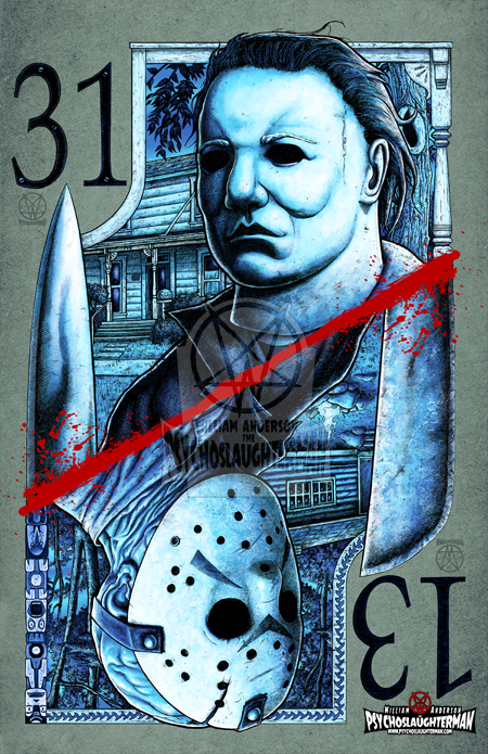 A 180 Print that you can Hang Either way up, Featuring 2 of the Biggest Slashers, Michael & Jason on their respective Days of the Year. Full Colour or Blue Variant are Available.